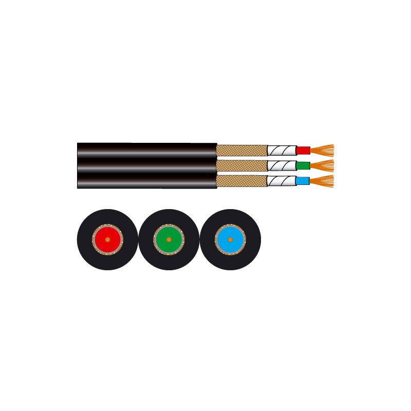 CARACTERISTICAS | Cable OFC profesional paralelo de alta conductividad de 3 conductores blindados individualmente. Especial para conexiones de vIdeo por componentes RGB y vIdeo/audio Medidas: 18 x 6 mm 3 cables: Cubierta exterior: 6 mm Ø, PVC negro Blindaje: 48 hilos de Cu de 0'1 mm Ø trenzados y cinta de aluminio mylar Cubierta de conductor: 3 mm Ø, rojo, verde o azul Conductor: 15 hilos de Cu de 0'12 mm Ø | |