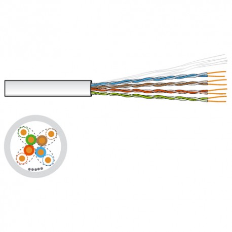 CARACTERISTICAS | Cable Cat 5e UTP 100 MHz de 8 conductores rIgidos agrupados en 4 pares trenzados con colores codificados para voz y datos Nylon de rasgado Cubierta exterior: 5'3 mm Ø, PVC gris 8 cables: Cubierta de conductor: 0'9 mm Ø, PE verde, verde/blanco, naranja, naranja/blanco, marrón, marrón/blanco, azul, azul/blanco Conductor: 1 hilo de CCA de 0'5 mm Ø (24 AWG) | |