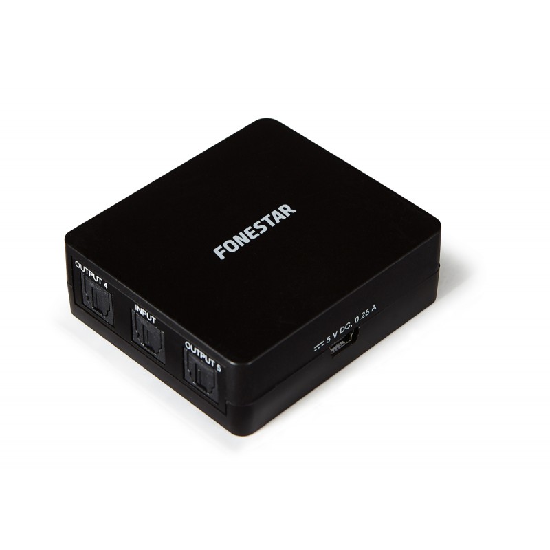 Ver más grande CARACTERISTICAS | Distribuidor de audio digital óptico toslink 1 x 5. 1 entrada a 5 salidas con conectores ópticos toslink. Tasa de datos máxima 16 Mbps. Longitud de cable de salida hasta 40 m (cable con atenuación <0.2 dB/m). Permite conexión en cascada. | |
